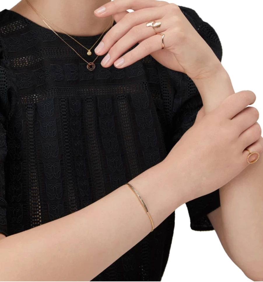 Beyond its minimalist appearance, this Bonnie bracelet designed by 5 Octobre sets itself apart by its contemporary design. The combination of blackened silver and gilded silver, enhanced by the brilliance of diamonds, emphasizes Sophie Pfeffer’s taste for mixing materials and inspirations. It will shine on your wrist when you roll up the sleeves of a shirt.
