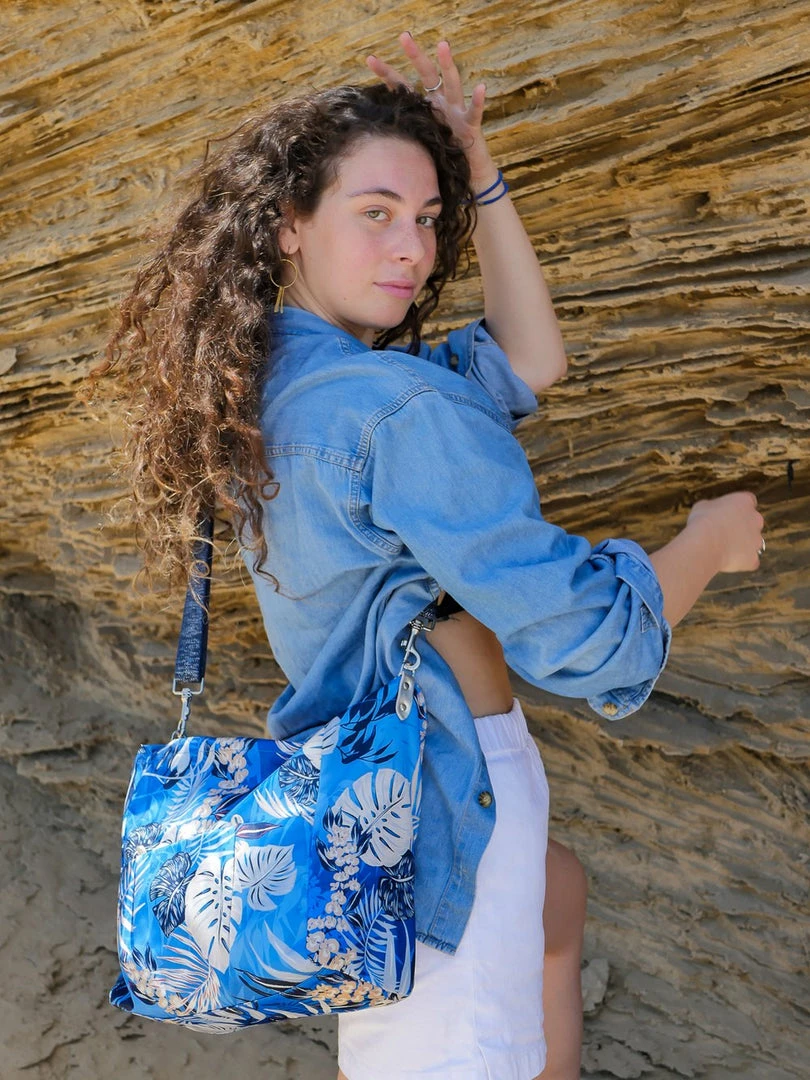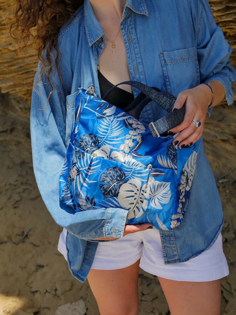 Allegra shoulder/crossbody bag made from high quality Italian satin nylon and full grain gold leather. Closed with a Swiss made metal zip, Allegra has an inside zipped pocket, two front pockets closed with press studs and an adjustable woven lurex crossbody strap. Perfect for everyday use, highly practical, lightweight and comfortable, the Allegra holds A4 documents and all your gym gear!.