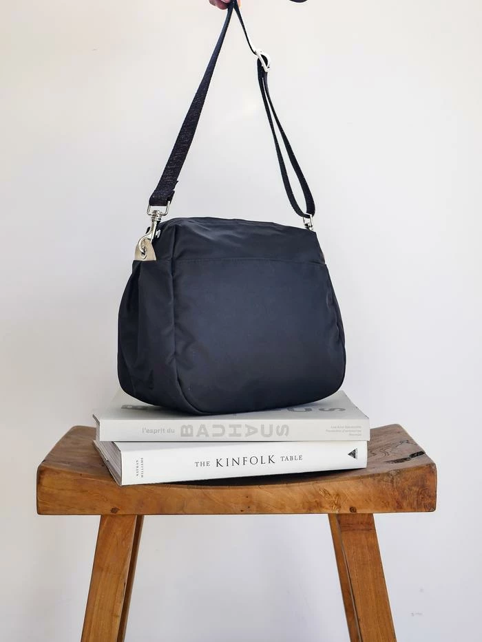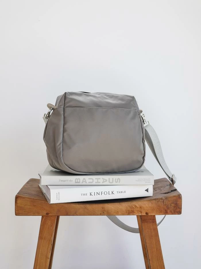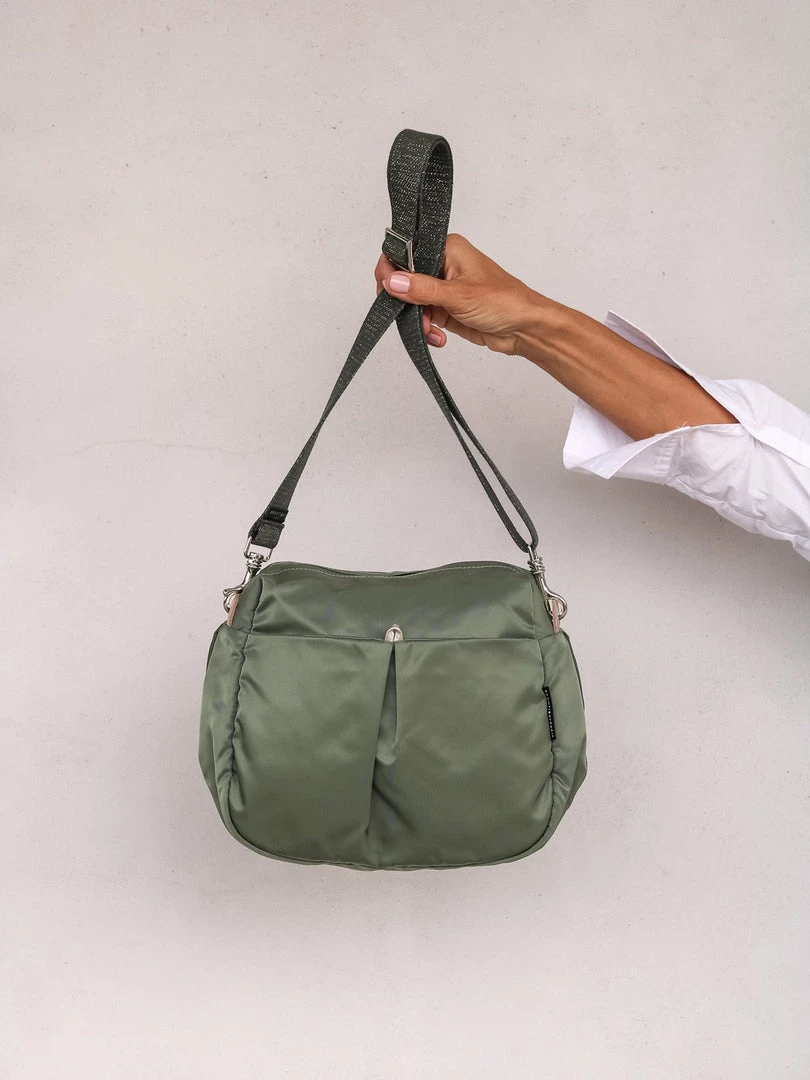 You will love the hands free life with our Ravello bag in satin nylon and light gold leather details. Ravello has a silver zipper closure, 2 outside snap pockets and a comfortable 1.25″ woven lurex shoulder strap. Ravello is light, practical, fun and comfortable to use. For a larger size, see Kit satin nylon bag. For the same style in a metallic finish try the Westside Glam.