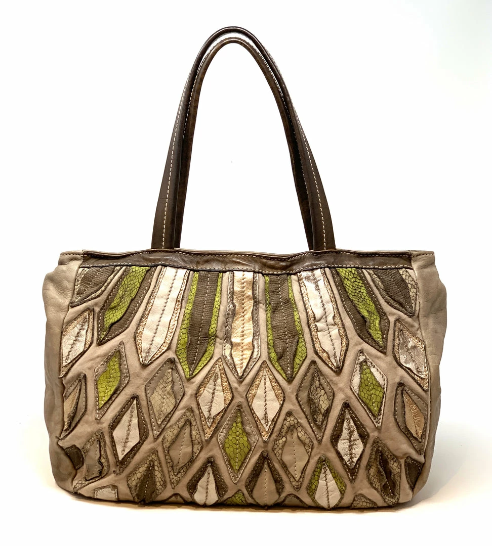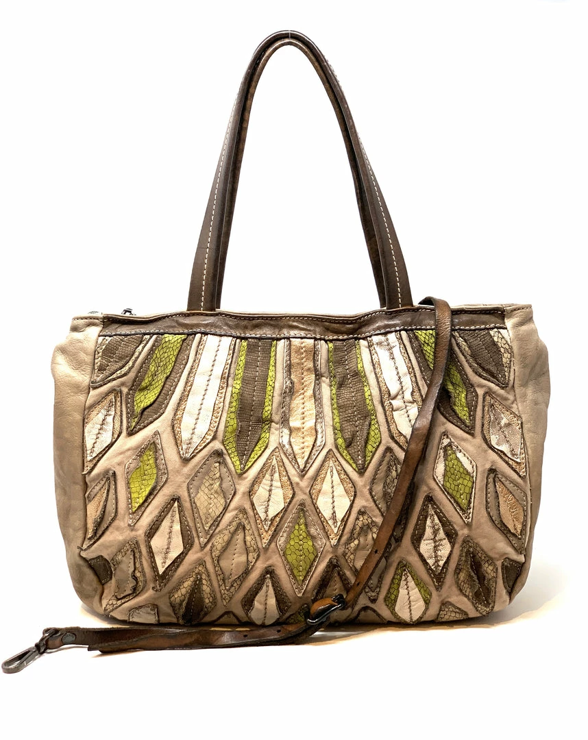 Leather tote with an ornate hand appliquéd abstract leaf motif on one side and a natural, raw leather side on the other for two different looks. Shoulder straps have a long generous drop of 14″ and comes with a detachable crossbody belt strap that is fully adjustable.