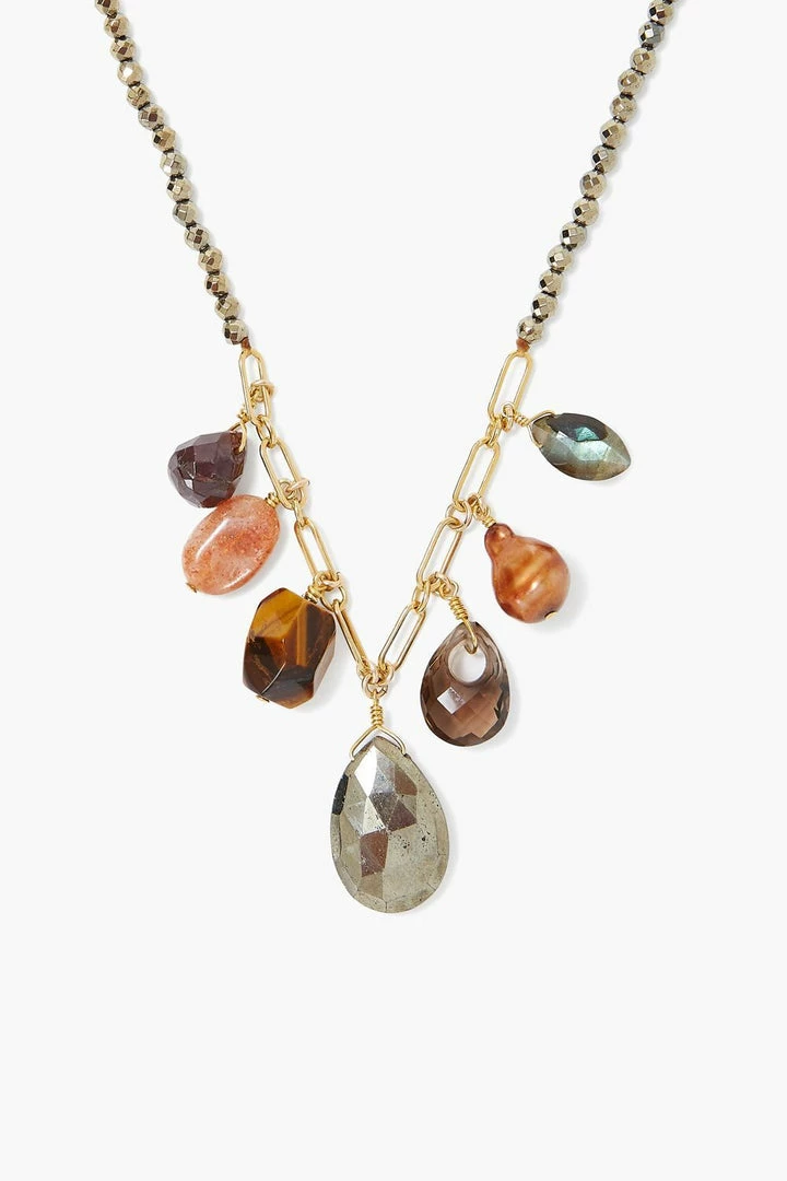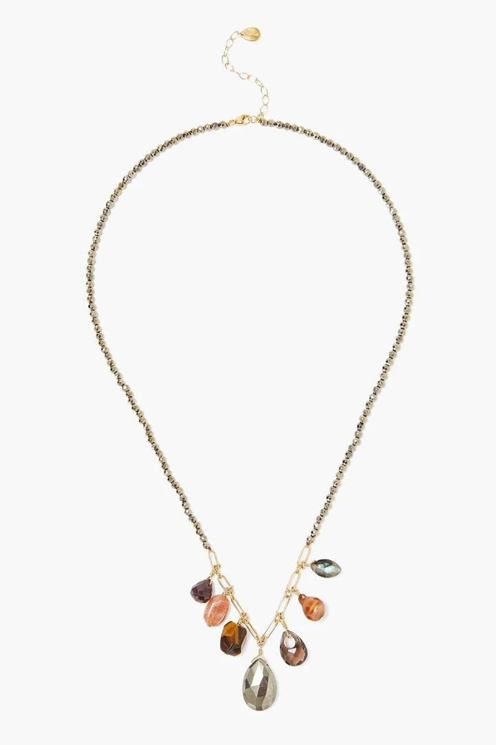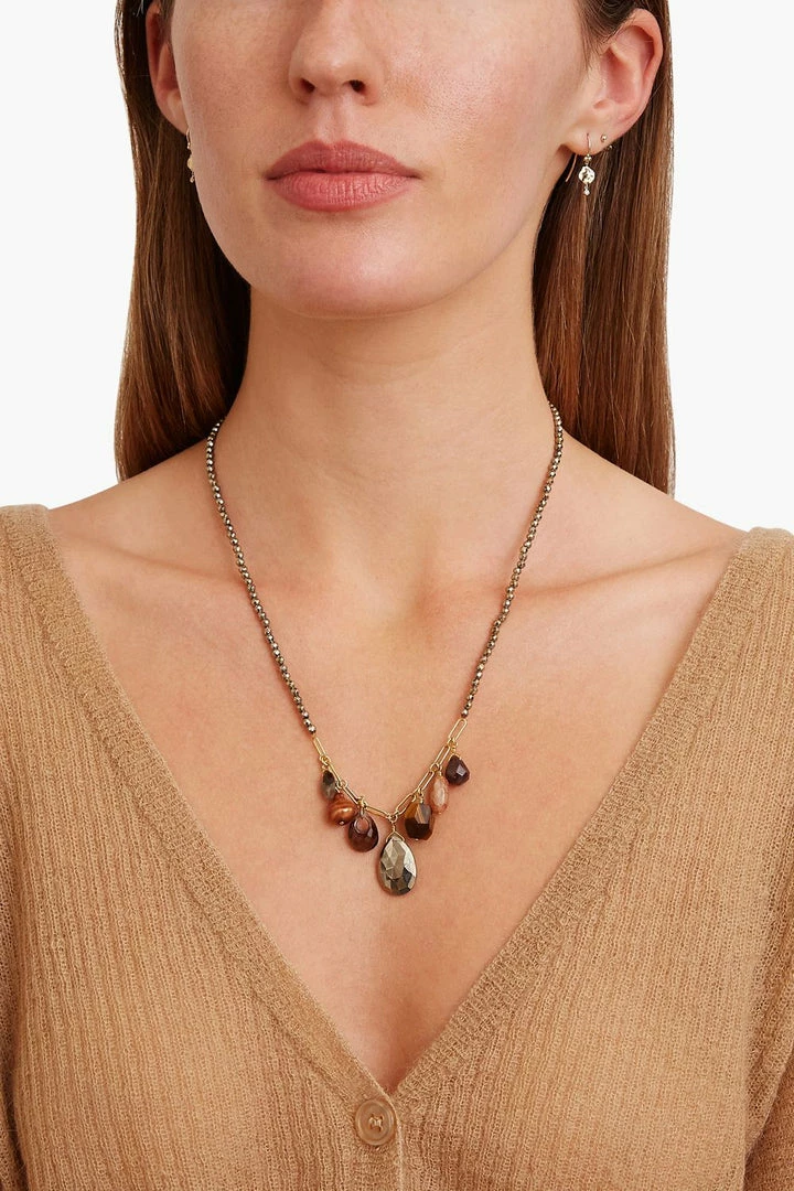 Rich gemstones combine, creating a striking color palette. This necklace features sunstone, tiger’s eye, labradorite, smoky quartz, a baroque copper pearl and a garnet briolette suspended from a strand of pyrite. Fastens with an 18k gold plated sterling silver lobster clasp.
