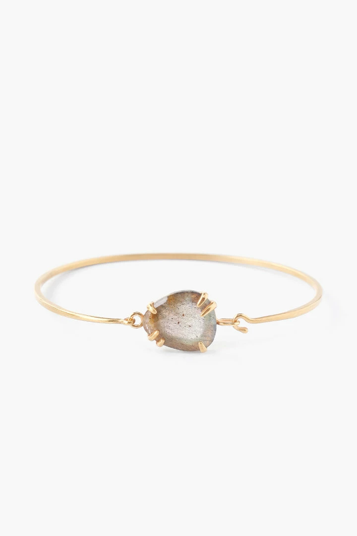 This bangle features a semi-precious accent stone on a prong setting. We love that it’s easy to get on and secure