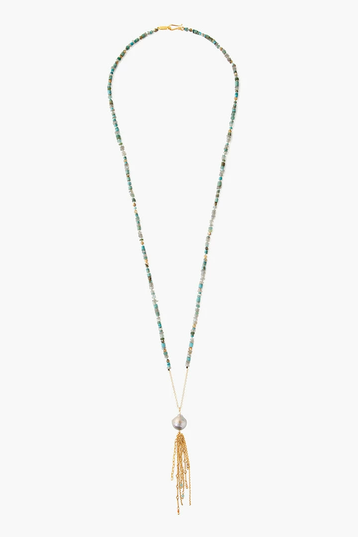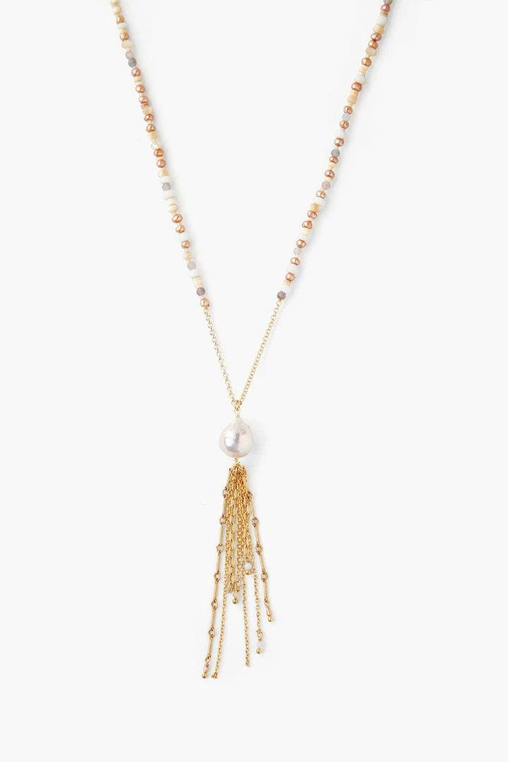 a string of semiprecious stone beads terminate in a freshwater pearl accented tassel of gold plated sterling silver. Makes this a great statement for your unstructured flowy summer outfits