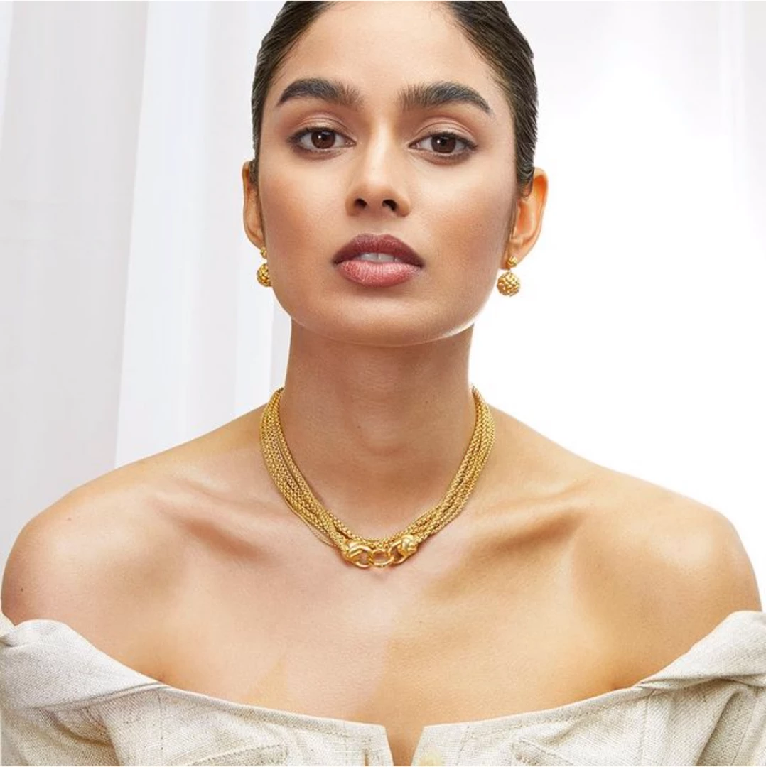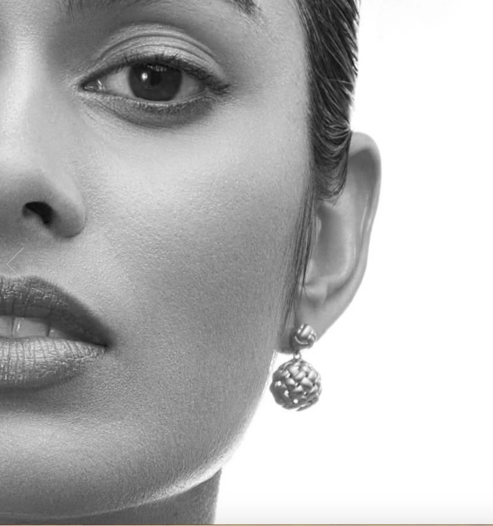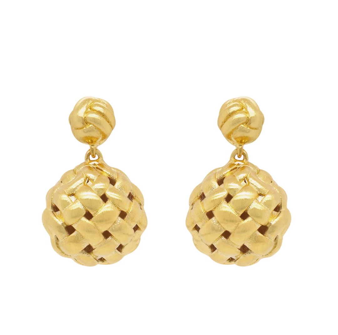The Braided Orb Droplet Earrings each feature a hollow golden basket suspended from a woven knot stud. Remarkable in both their lightweight construction and intricate details, the sumptuous texture of the earrings are enhanced by DD’s signature brushed gold finish.Â