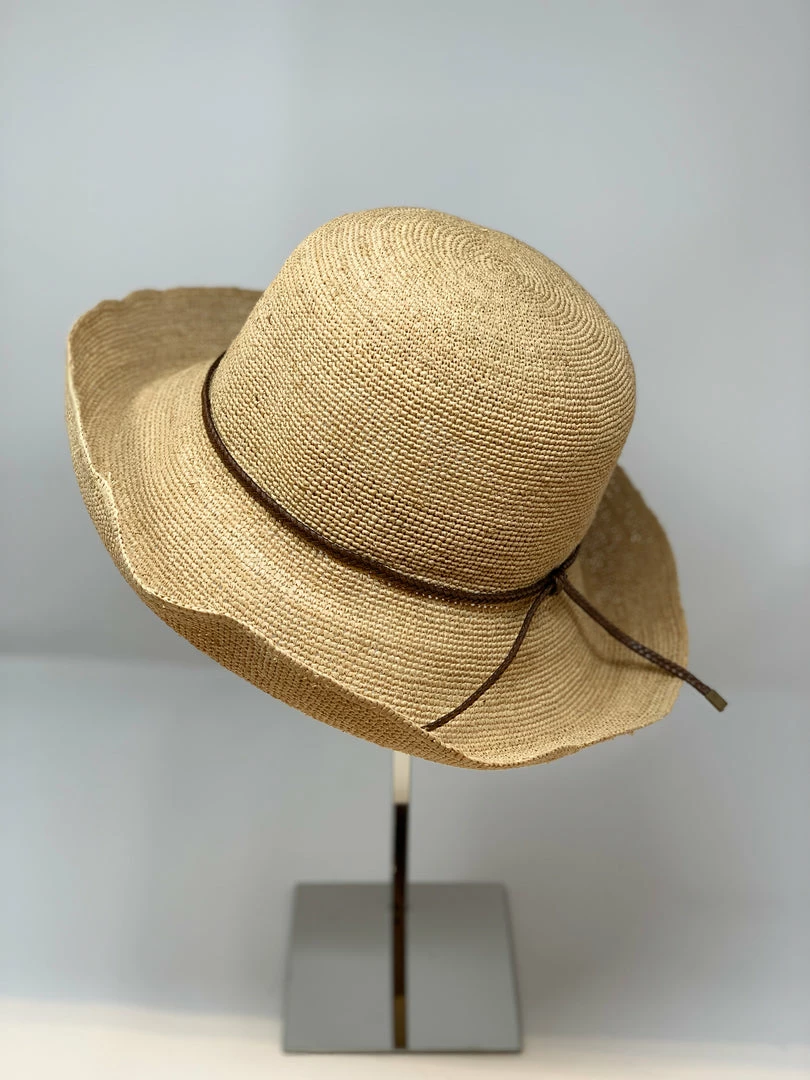 Lightly wired asymmetrical 5″ brim and flexible crown make this hat flattering on any face shape. Designed to be folded in half for easy packing.