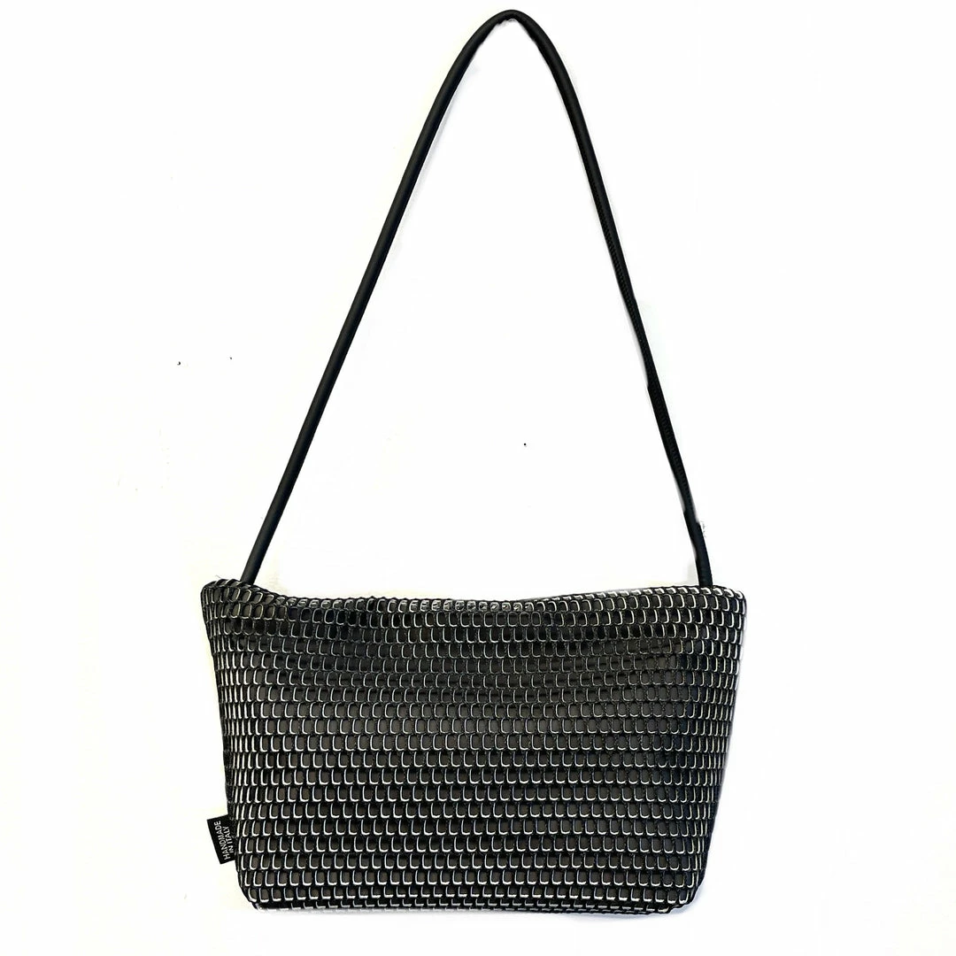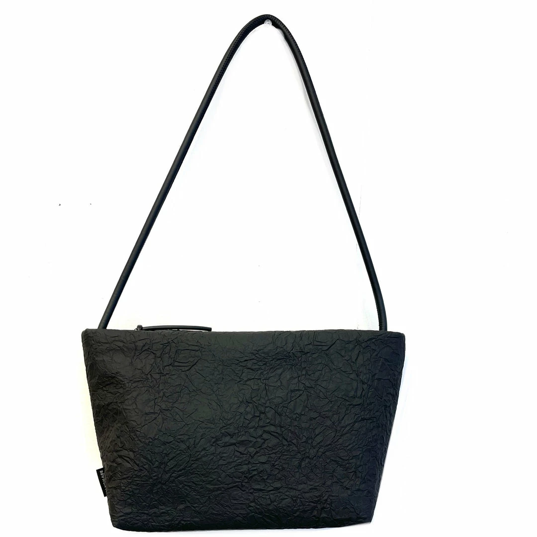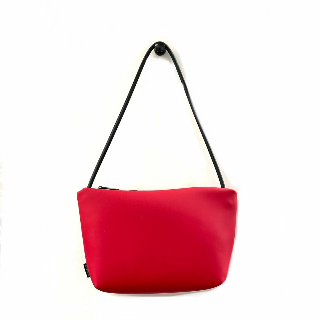 Neoprene shoulder strap attached to different waterproof technical fabrics. With no visible hardware, this is a chic minimalist update to the classic crossbody. Strap adjusts to shorter lengths by tying a knot on inside of bag. 100% vegan