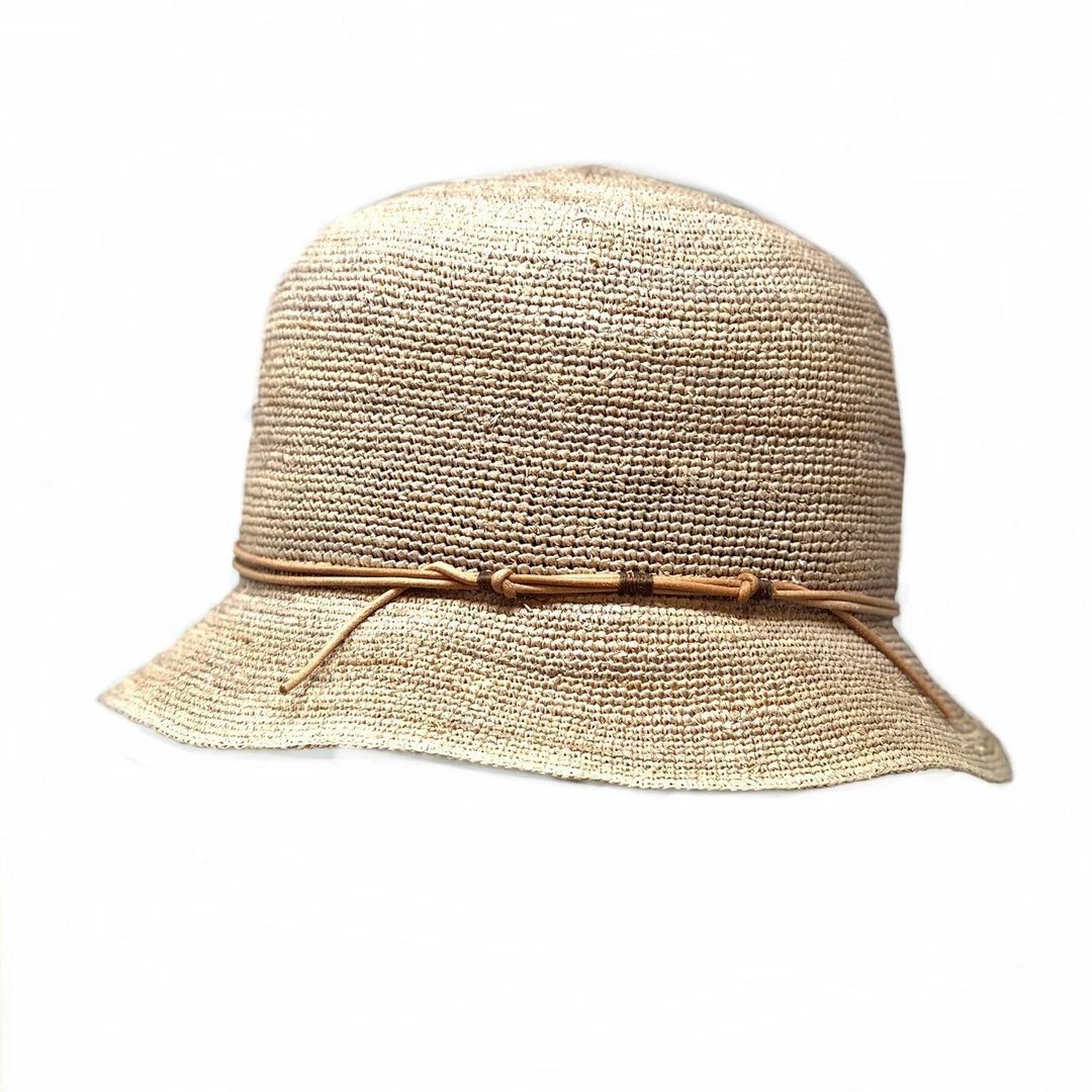 Raffia Hat made from uniquely textured weave pattern. Interior band hides an adjustor with velcro closure that easily tightens or loosens the hat 1 size.Â