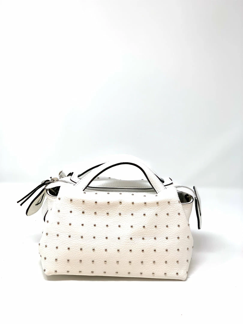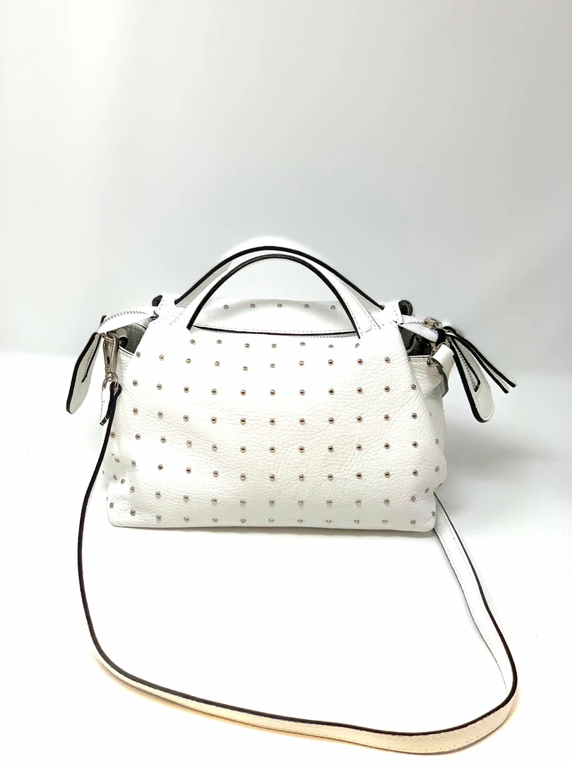 White pebble leather with silver studded accents. Roomy design makes this a versatile day to night bag.