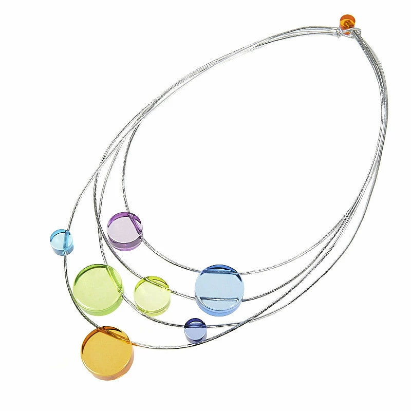 Small raised circles of diameters ranging from .25″-1″Â assembled on a metallic elastic thread (no nickel)