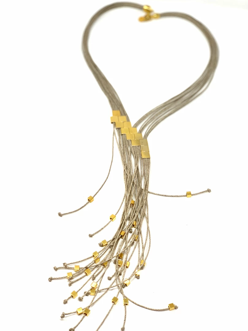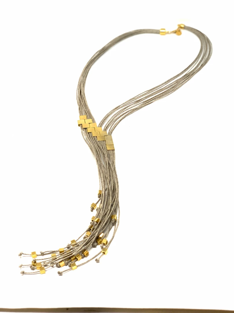 A necklace fit for a goddess. Thin hemp cords in a natural beige flecked with 1/2″ 24K yellow gold-plated brass squares strung on a diagonal, cascade into streams of square beads