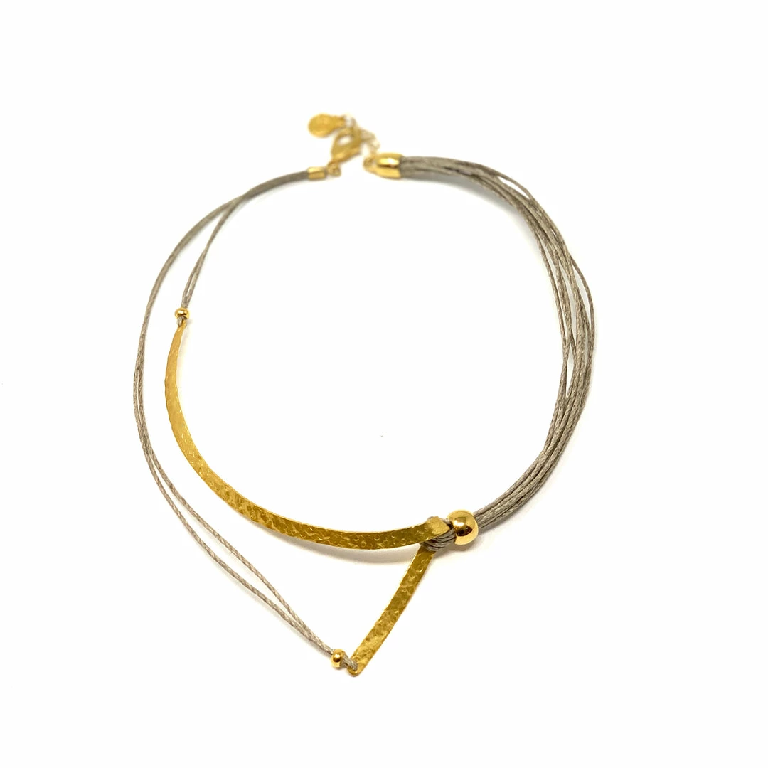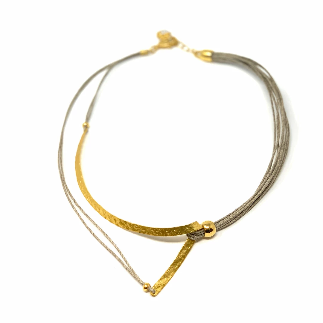 A necklace fit for a goddess. Thin hemp cords in a natural beige flecked with 5″ torqued, hand-hammered 24K yellow gold-plated brass arch.Â