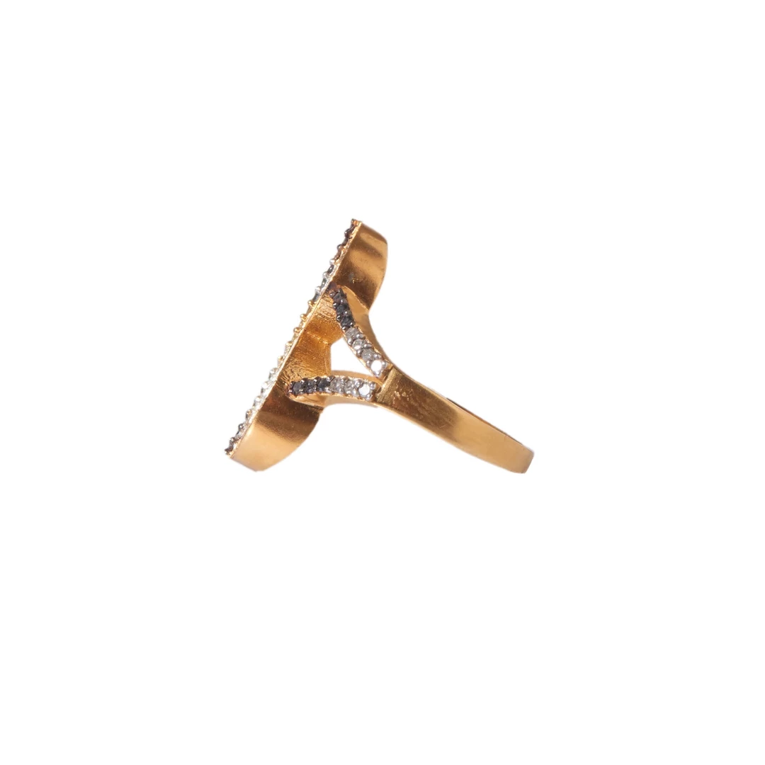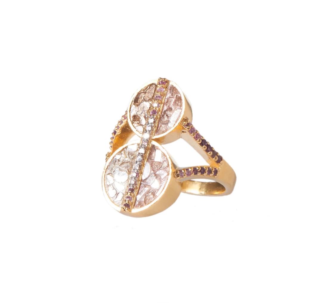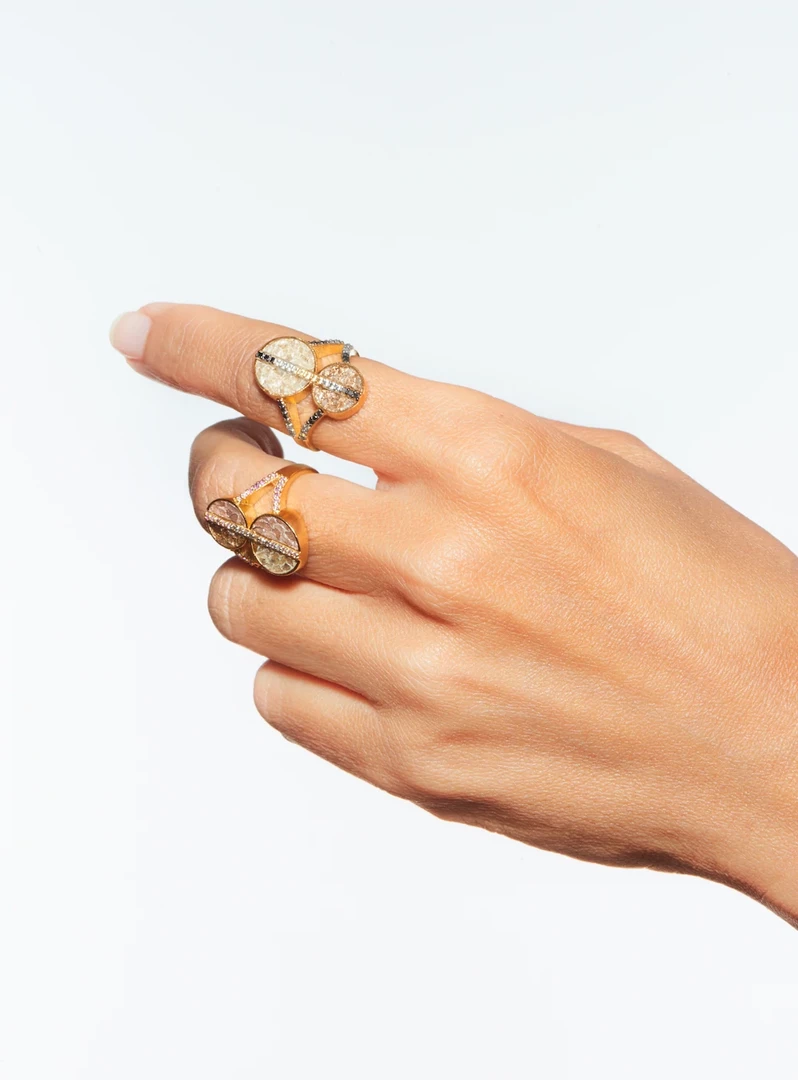 Time moves slowly, yet all at once. We cannot cling to moments, no matter how hard we try. This ring encompasses each half of the journey through time, with champagne diamonds and white diamonds adorning each side of this piece.